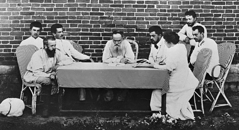 22.08.1891 Писатель Лев Толстой (в центре) беседует с членами организации помощи голодающим крестьянам.Фото: РИА Новости